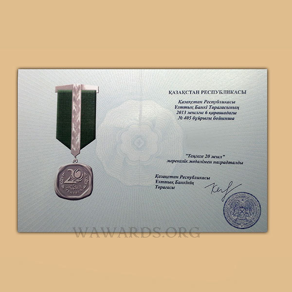 - Medal was awarded to citizens of the Republic of Kazakhstan and foreign citizens who have made a significant contribution to the functioning of the national currency of the Republic of Kazakhstan - the Tenge.