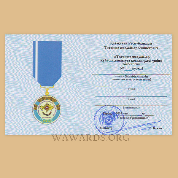 - Medal was awarded to employees of emergency response agencies, as well as citizens of the Republic of Kazakhstan and foreign countries, for active public service and significant contribution to the development of the state system for the prevention and elimination of emergency situations.