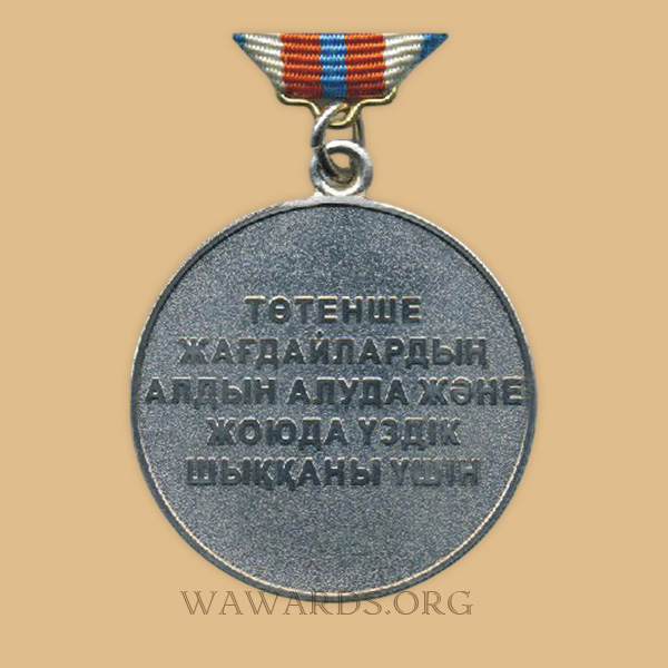 • Medal is awarded to employees of emergency response agencies of the Republic of Kazakhstan who exemplarily fulfill their duty to protect the population from accidents, disasters, fires, and natural disasters, as well as to other individuals who actively participate in emergency prevention and response efforts and who have demonstrated courage and dedication in doing so.