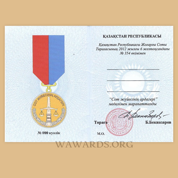 - Medal is awarded to judges, including those whose powers have been terminated, who have served impeccably in the judicial system for 15 or more calendar years in accordance with the current legislation of the Republic of Kazakhstan; employees of the Department for Support of Court Operations under the Supreme Court of the Republic of Kazakhstan and its territorial divisions, as well as other individuals who supported the operation of the courts, who have served the judicial system for 25 or more calendar years in accordance with the current legislation of the Republic of Kazakhstan.