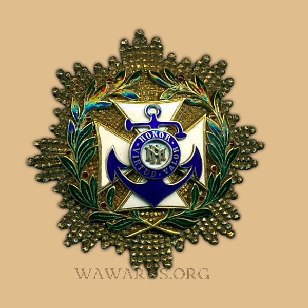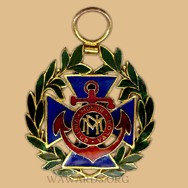 • Order was awarded in six categories, depending on the color of the enamel and ribbon: Naval Merit - dark red; Bravery in Combat - purple; Humanitarian Acts - red and white; Good Conduct - blue; Continuous Service - blue and white; Special Services - green; Other Services - white.