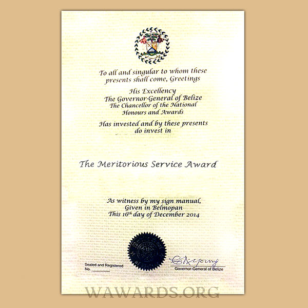 Medal is awarded to Belizeans or foreign nationals for meritorious service to Belize.