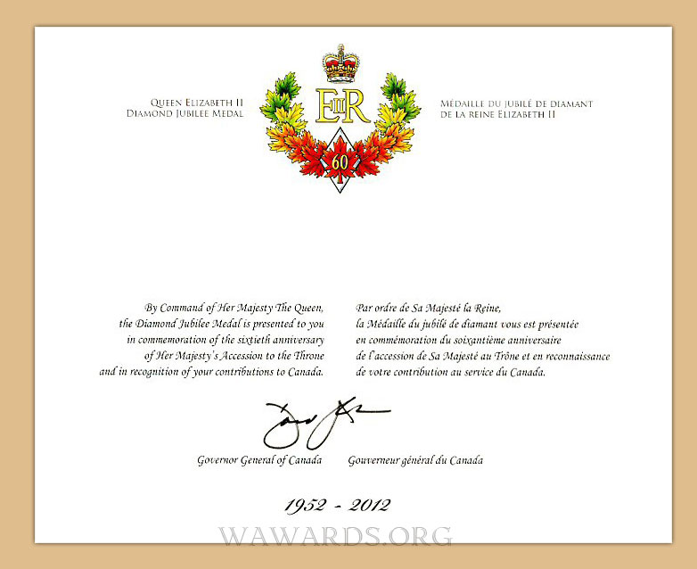 - Медаль учреждена 6 февраля 2012 года по случаю празднования 60-летия восшествия на трон королевы Елизаветы II.