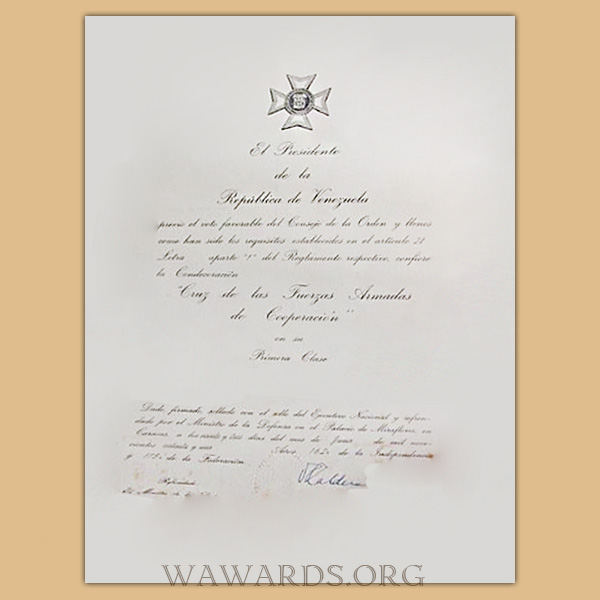 - Decoration is awarded for distinguished services rendered to the Bolivarian National Guard of Venezuela (also called the Armed Forces of Cooperation).