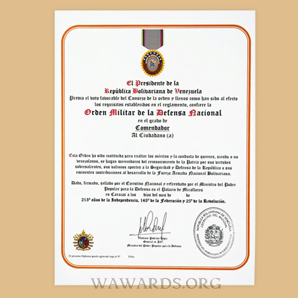 • Order is awarded to Venezuelans or foreigners for contributions to the security and defense of Venezuela or for contributions to the development of the National Armed Forces.