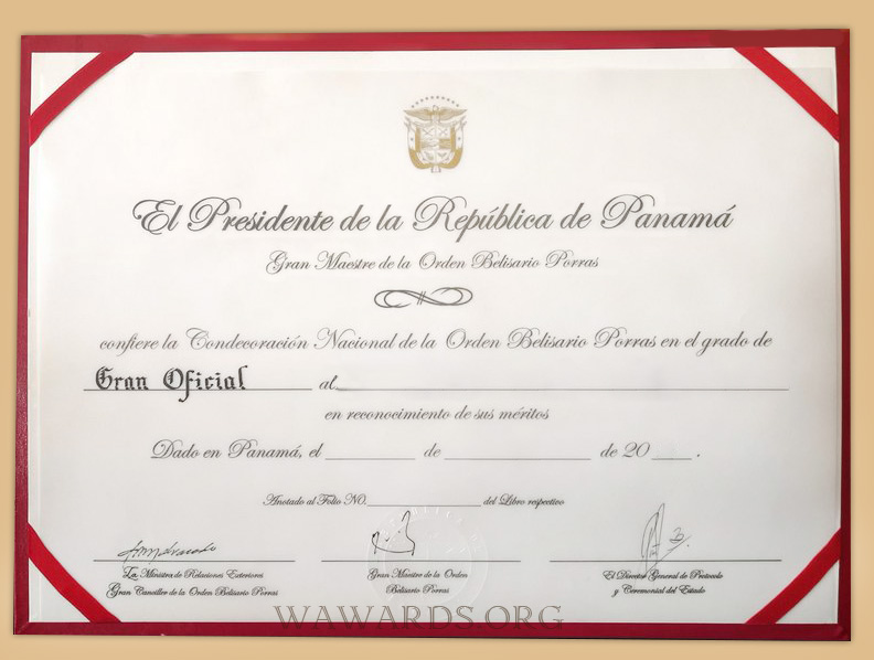 - Order awarded to Panamanian citizens for their contributions to the Nation in the scientific, artistic, literary and humanitarian fields.